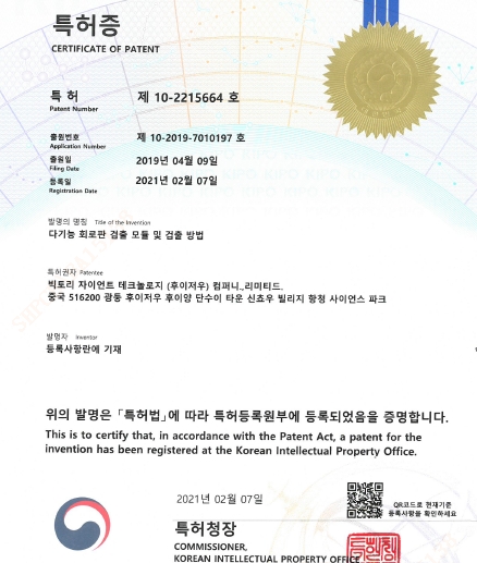 近日,我司收到2项PCT国际专利进入韩国的授权证书,专利名称“一种多功能线路板检测模块及检测方法”、“一种不同板料混压的高频板制作方法”。以上专利在2017年通过国际专利合作条约PCT途径申请后于2019年1月进行国际公布,分别于2021年2月、2020年11月在韩国获得授权登记。