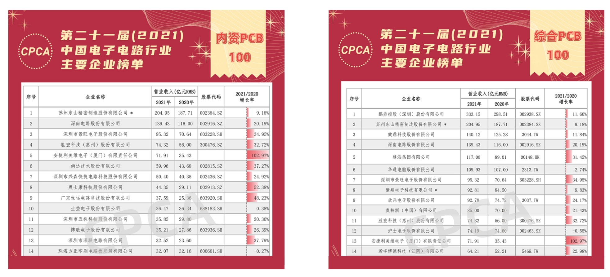 据悉,在此次发布的中国电子电路行业企业榜单中,入榜的136家PCB制造企业的总营收超3300亿元,较去年增长20%以上,PCB制造企业营收同比呈上涨态势。综合PCB百强榜单中内资企业数量达64家,营收合计增长26.8%,占综合PCB百强榜单收入的48.4%,较去年增加2.5个百分点。内资企业保持快速增长,对中国电子电路行业发展的贡献度进一步提升